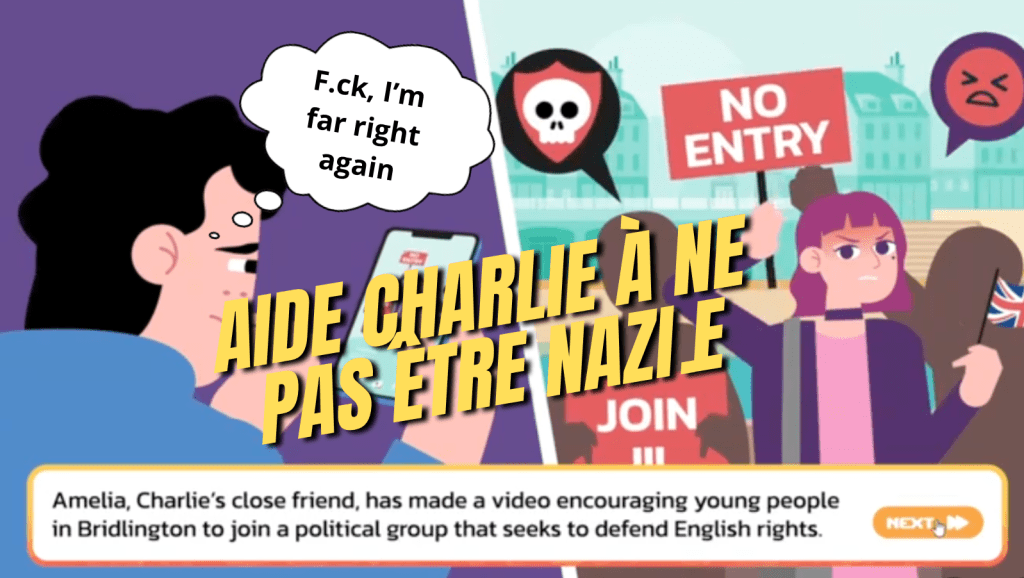 Si le compteur atteint 100, le jeu s’arrête net : Charlie, donc vous, est officiellement affecté au programme, avec accompagnement obligatoire, surveillance accrue et inscription dans les fichiers des potentiels terroristes d’ultra droite. Le scénario, écrit avec candeur, transforme la moindre interrogation, la moindre inquiétude, le moindre désaccord sur l’immigration de masse ou sur la gestion de l’asile en indicateur de risque d’extrémisme de droite. Les graphismes sont modestes, presque naïfs, comme un jeu Flash des années 2000, mais l’intention est limpide : apprendre aux adolescents que certaines questions ne se posent pas, ou du moins pas sans conséquences.